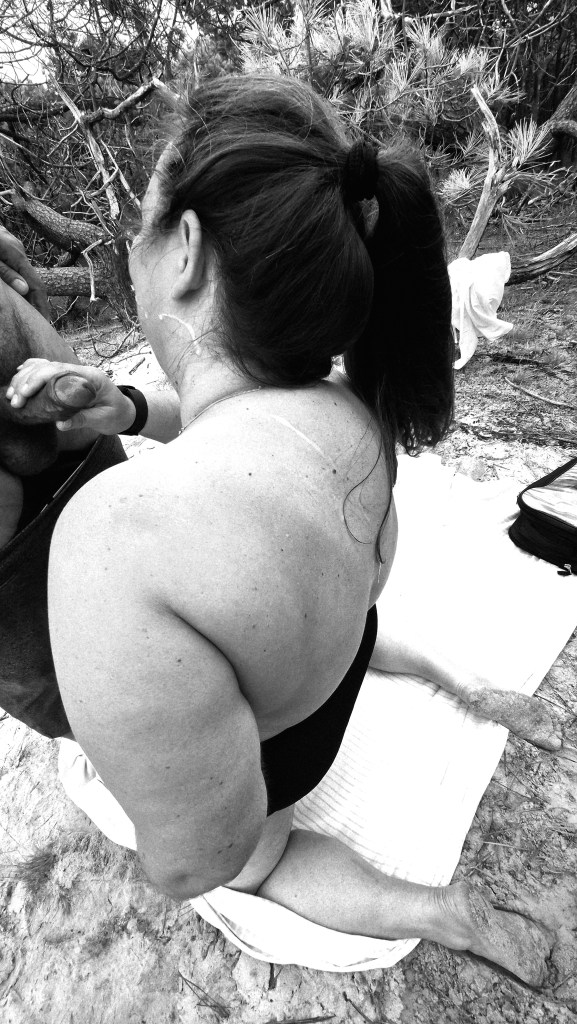 A ma droite, j’aperçois Henri qui joue le metteur en scène derrière des branches de pin, téléphone en main. Sentant J. vraiment bandé, je lui propose de me prendre. Il enfile un préservatif pendant que je me tourne et lui présente mon fessier. Il n’y a pas tellement de prises possibles aux branches des pins, trop souples et les troncs morts sont plus souvent un danger qu’un véritable support (je parle en connaissance de cause). Me voilà donc pliée en 2 les mains sur mes cuisses pour rendre accessible mon antre toute mouillée. J. se révèle être à la hauteur parfaite pour me prendre ainsi. Il trouve l’entrée assez facilement, ce qui n’est pas le cas pour la plupart des hommes lorsque je me fais prendre en levrette. Il imprime un rythme régulier, ni trop lent ni trop rapide. Parfois il accélère quelques instants. Je sens la jouissance monter mais sur le point de jouir, je manque de tomber en avant. Je me rattrape avec les mains que je décide de laisser au sol pour mieux me stabiliser. J., imperturbable, poursuit ses allers-retours. Je sens que ma jouissance avortée, peut revenir. Pour accentuer le rythme, je donne quelques coups de reins et je suis bientôt récompensée par une nouvelle montée de jouissance qui cette fois-ci atteindra son apogée. J’en avertit J. qui accélère ses va-et-vient également. Nous poursuivons la pénétration encore quelques minutes. Mais la position devient inconfortable pour mes jambes. J. semble également fatiguer. Je repasse en position agenouillée pour reprendre en bouche la queue de mon partenaire. Je m’active sur son sexe en alternant fellation, gorge profonde et branlette pendant qu’il titille mon sein gauche. J’en profite pour croiser et soutenir son regard à plusieurs reprises, ce qui semble l’exciter encore un peu plus.